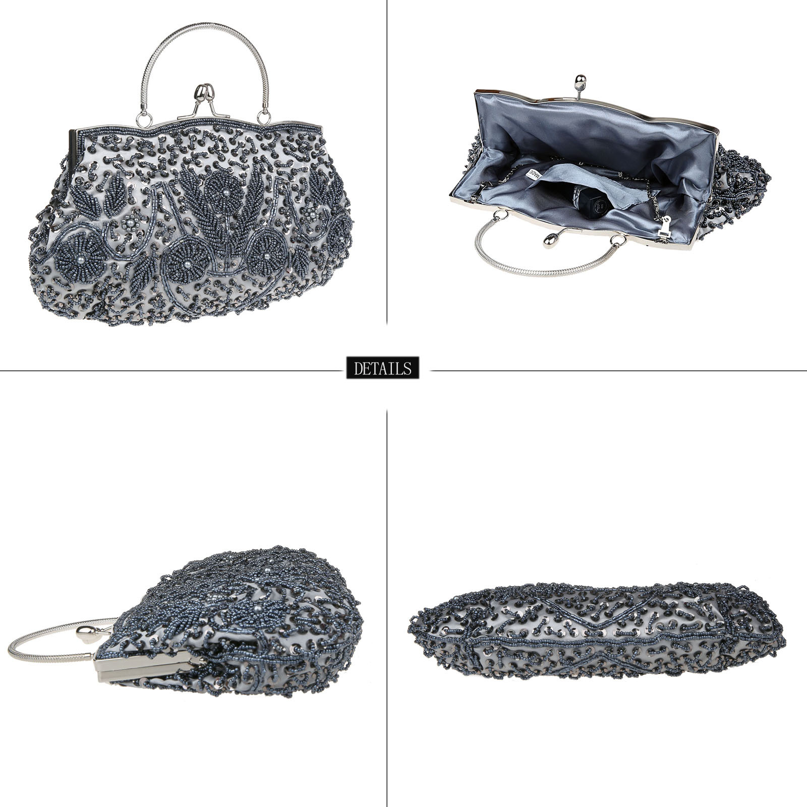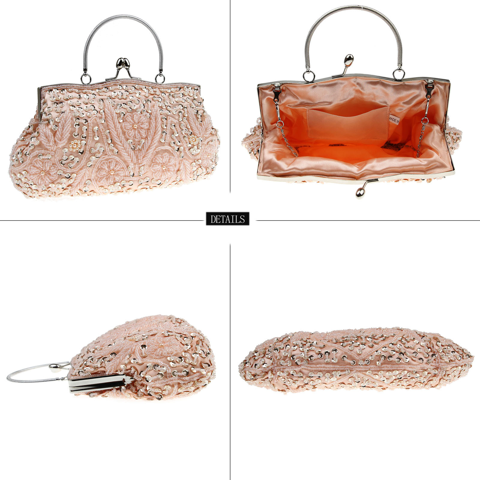 Material: Polyester lining, outer material varies by design (e.g., pearl accents, jacquard fabric).