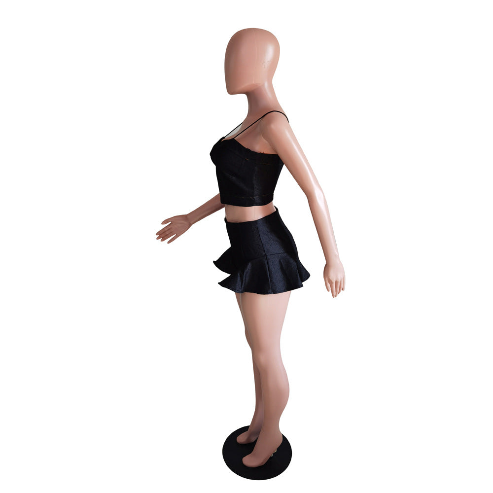 Stylish Design: Fashionable denim suspender and culotte two-piece set for a trendy look.