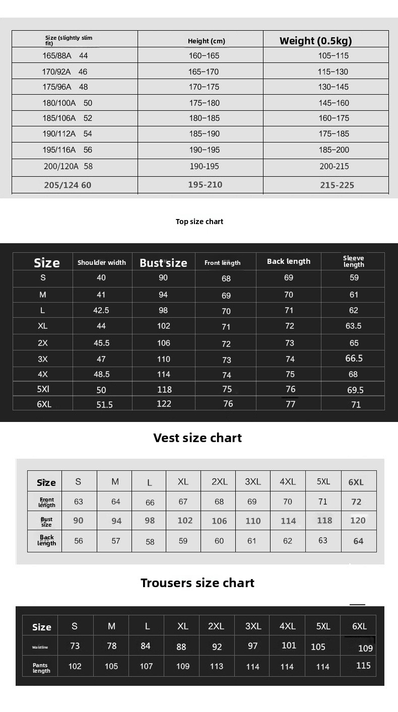 Sizes: 165-S, 170-M, 175-L, 180-XL, 185-XXL, 190-3XL, 195-4XL, 200-5XL, 205-6XL.