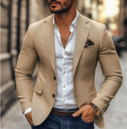 Style: Slim fit, single-breasted with two buttons, no slits, straight hem.